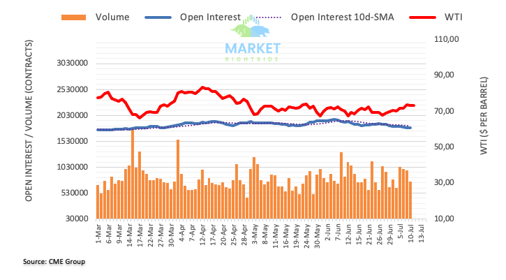 WTI prices began the new trading week on the back foot, as open interest and volume shrank. Against that context, the chance of additional decline looks reduced, perhaps paving the way for a challenge to the June high near $75.00 per barrel.