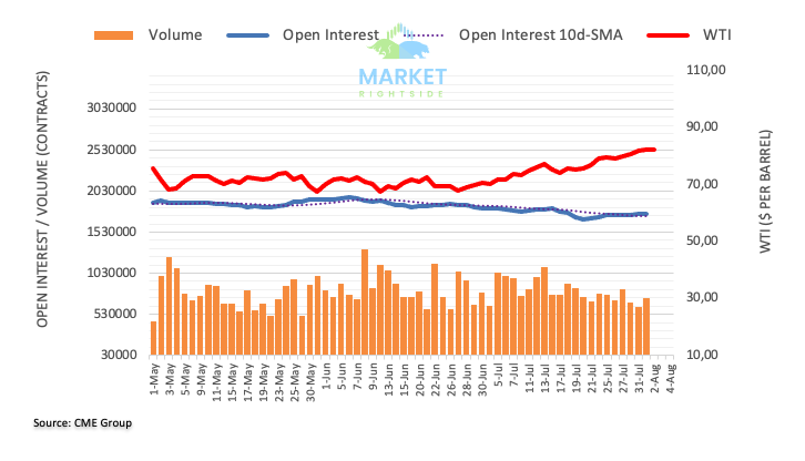 According to early CME Group data, open interest in crude oil futures markets increased for the second consecutive session on Tuesday, this time by roughly 2.1K contracts. Following two consecutive daily pullbacks, volume increased by approximately 106K contracts.
