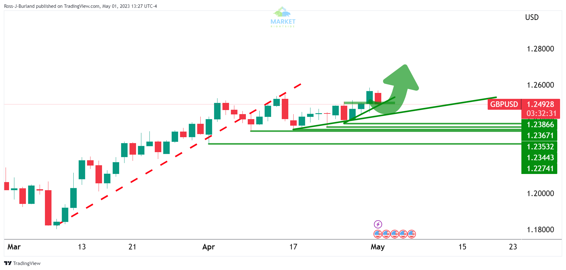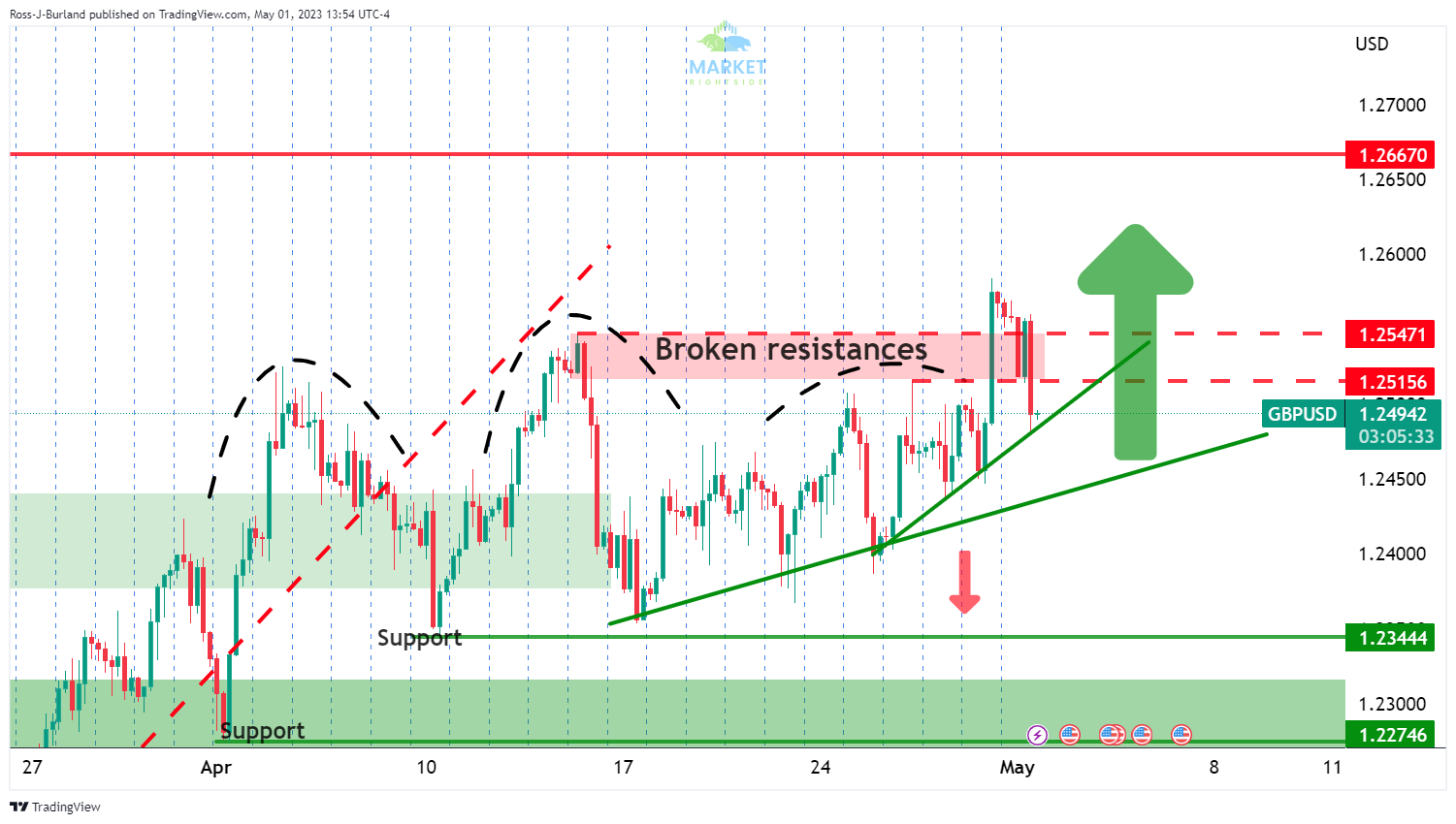 Although the diagram above is theoretical, it shows the main areas of support and resistance for the 4-hour period. The micro trendline is under pressure, but as long as the larger trendline holds true and intersects with 1.2450 or close to it, it would be logical to anticipate that the bulls will once again move in.